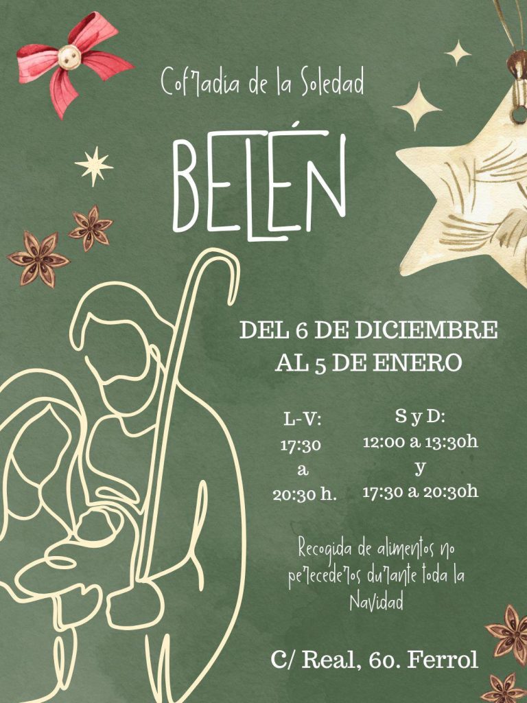 A Confraría da Soidade montará o seu Belén no número 60 da rúa Real. Segundo informa a irmandade, estará aberto do 6 de decembro ao 5 de xaneiro, en horario de luns a venres polas tardes, de 17.30 a 20.30h, e os sábados e domingos en horario de mañá e tardes, de 12.00 a 13.30 e de 17.30 a 20.30h.