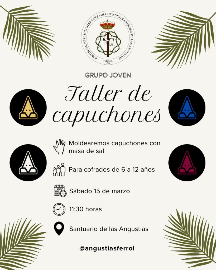 El Grupo Joven de la Cofradía de las Angustias informa de la organización de un taller, el próximo sábado 15 de marzo, para moldear capuchones. La actividad será a las 11.30 horas y en el mismo se elaborarán pequeñas figuras de penitentes, con su capuchón, de masa de sal.
